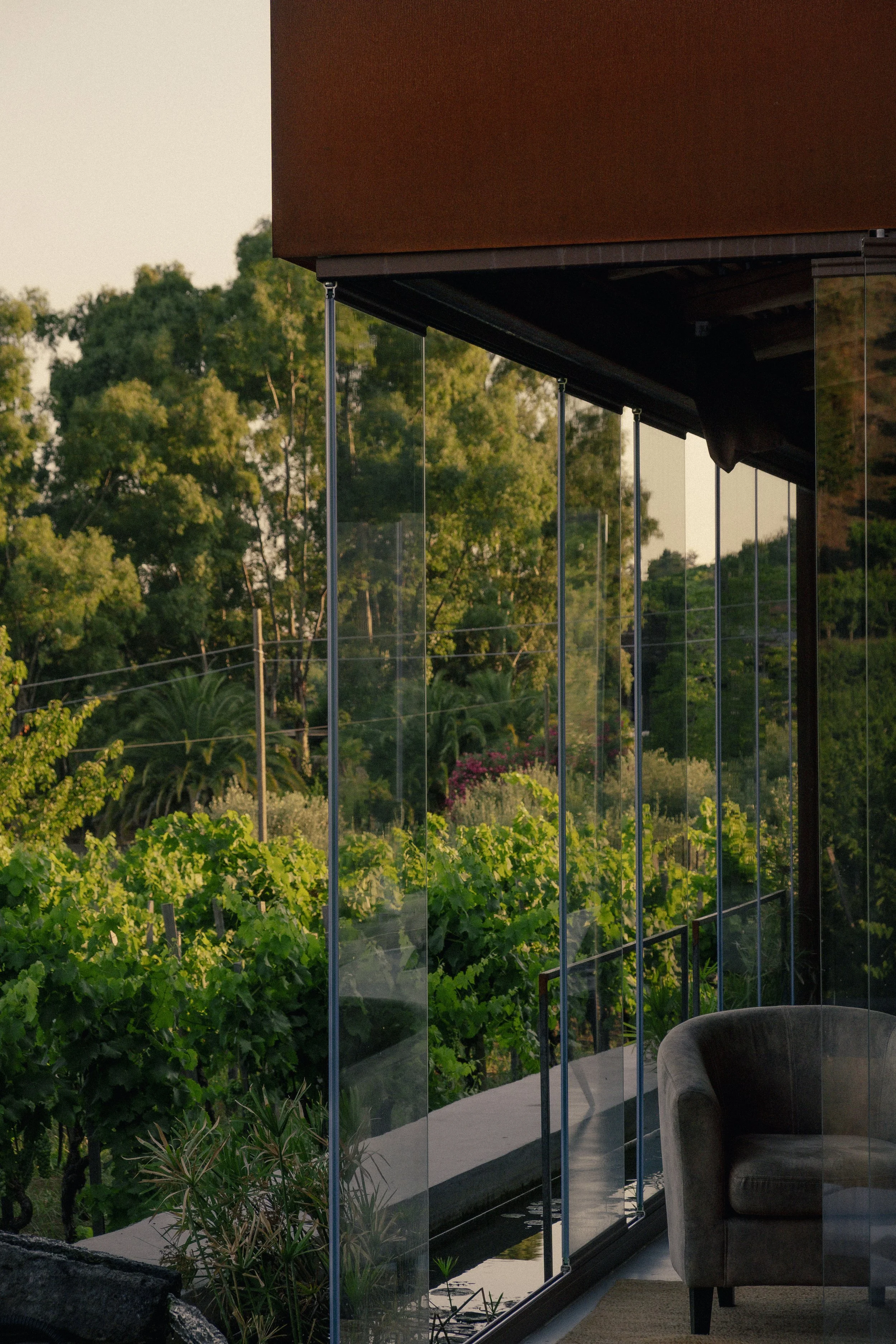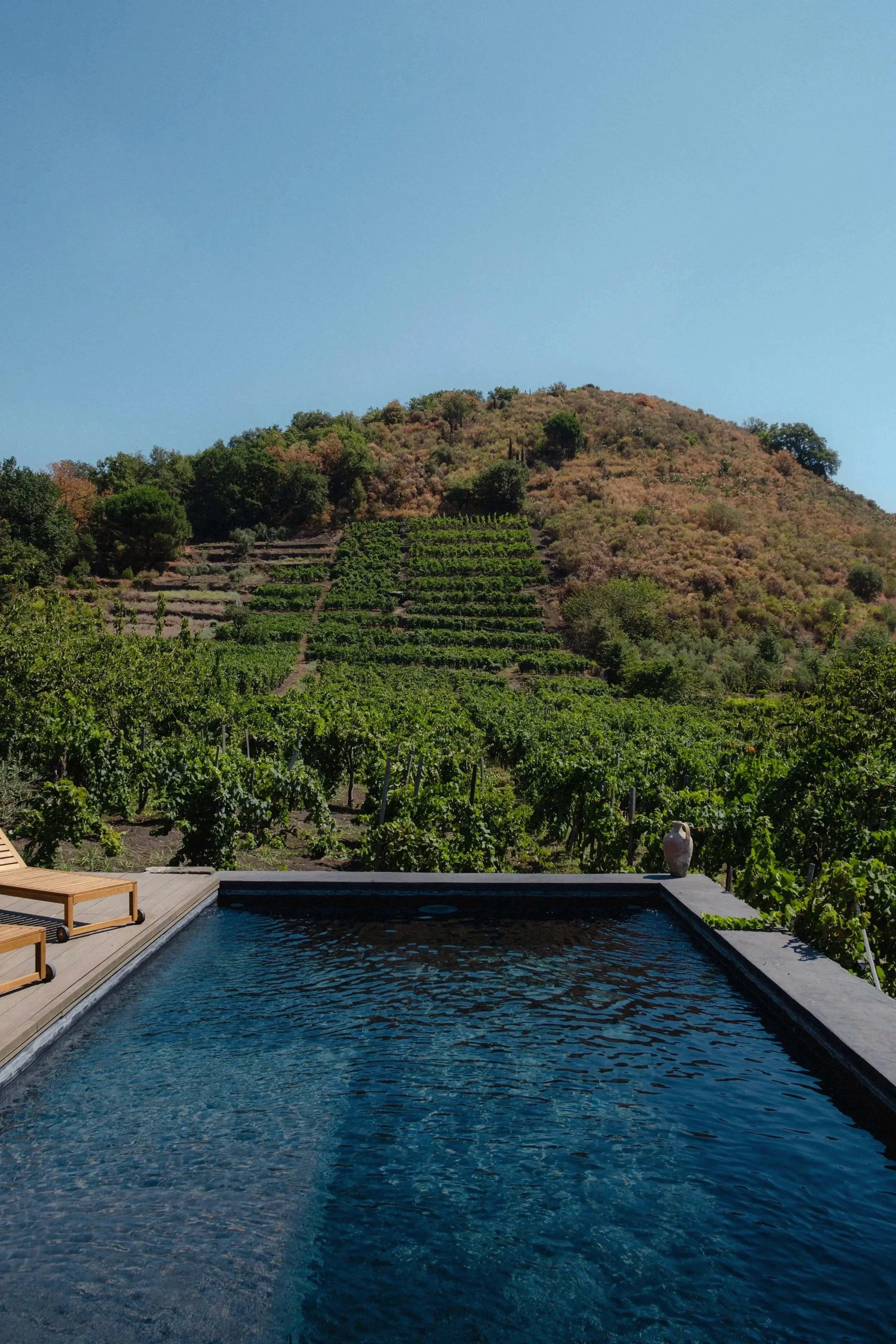 The structure was designed by Ciro, an architect by profession, to provide our guests with a peaceful oasis to relax in the beautiful vineyard with views of the sea to the south east and the summit of Mount Etna to the north west.”