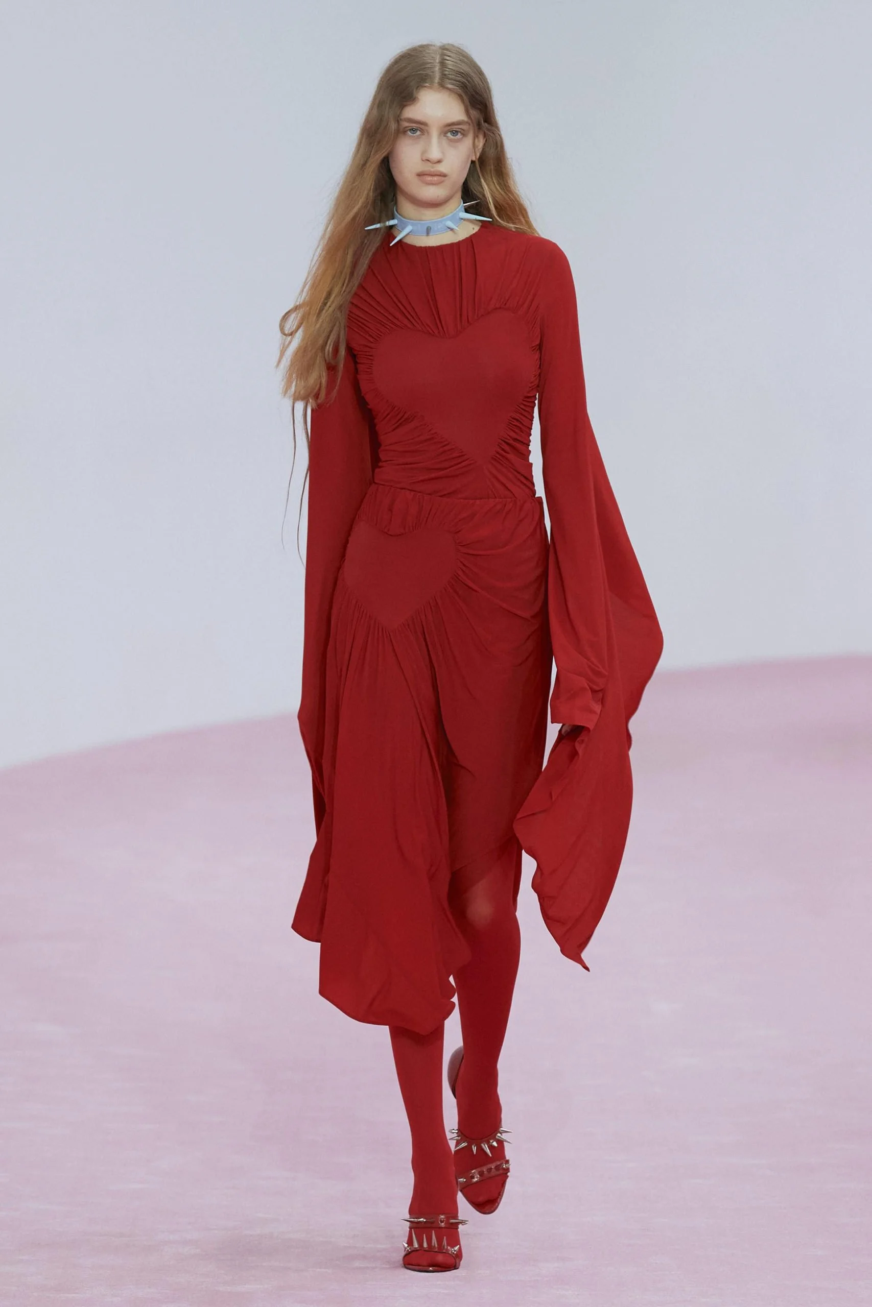 Spring/Summer 2023 is called Twisted Wedding, inspired by kitschy elements at weddings. In this collection, we see suits and dresses made of pastel-colored satin, mixed with red and black tones. The collection also features bags and shoes adorned with large metal studs.